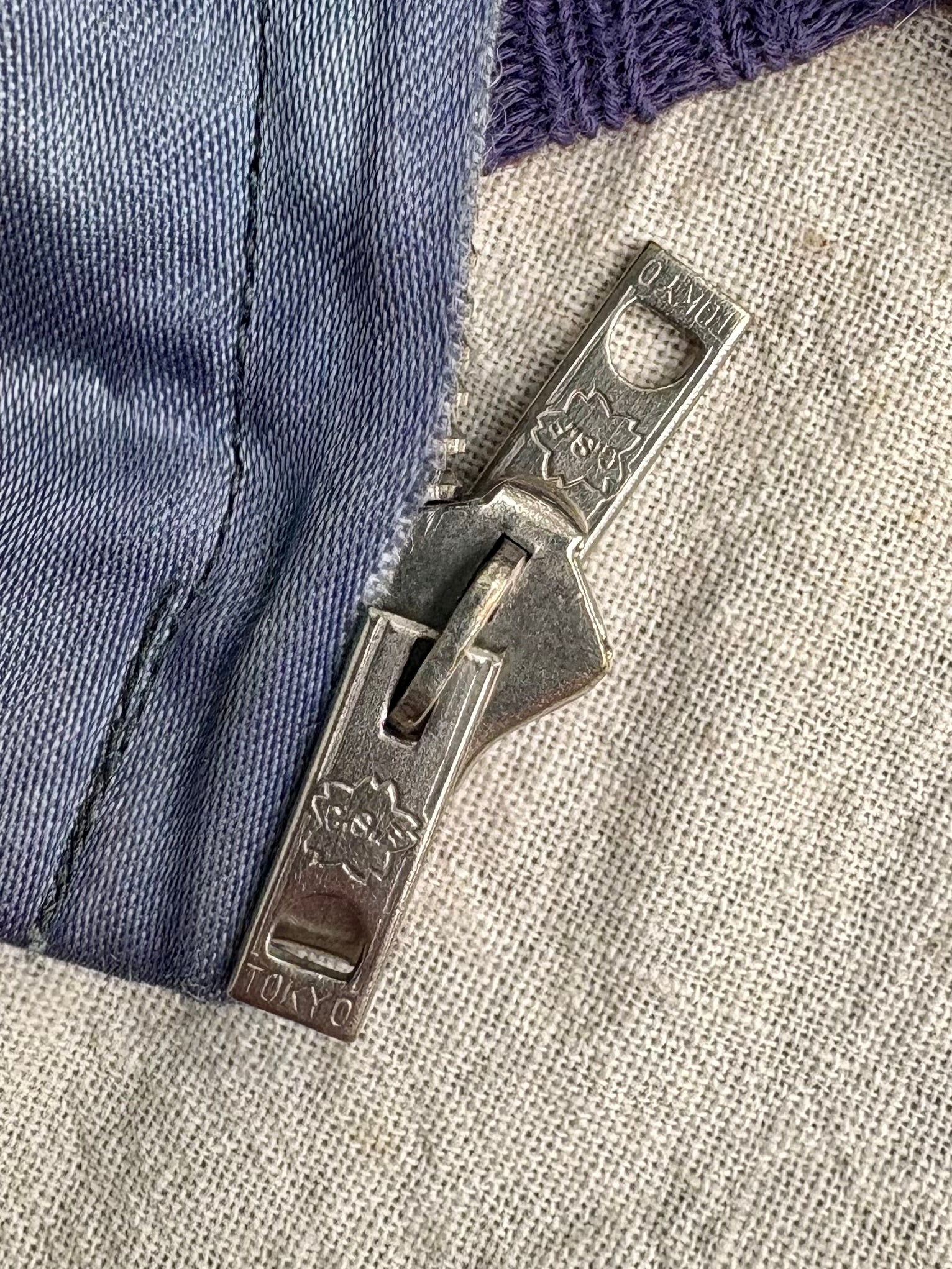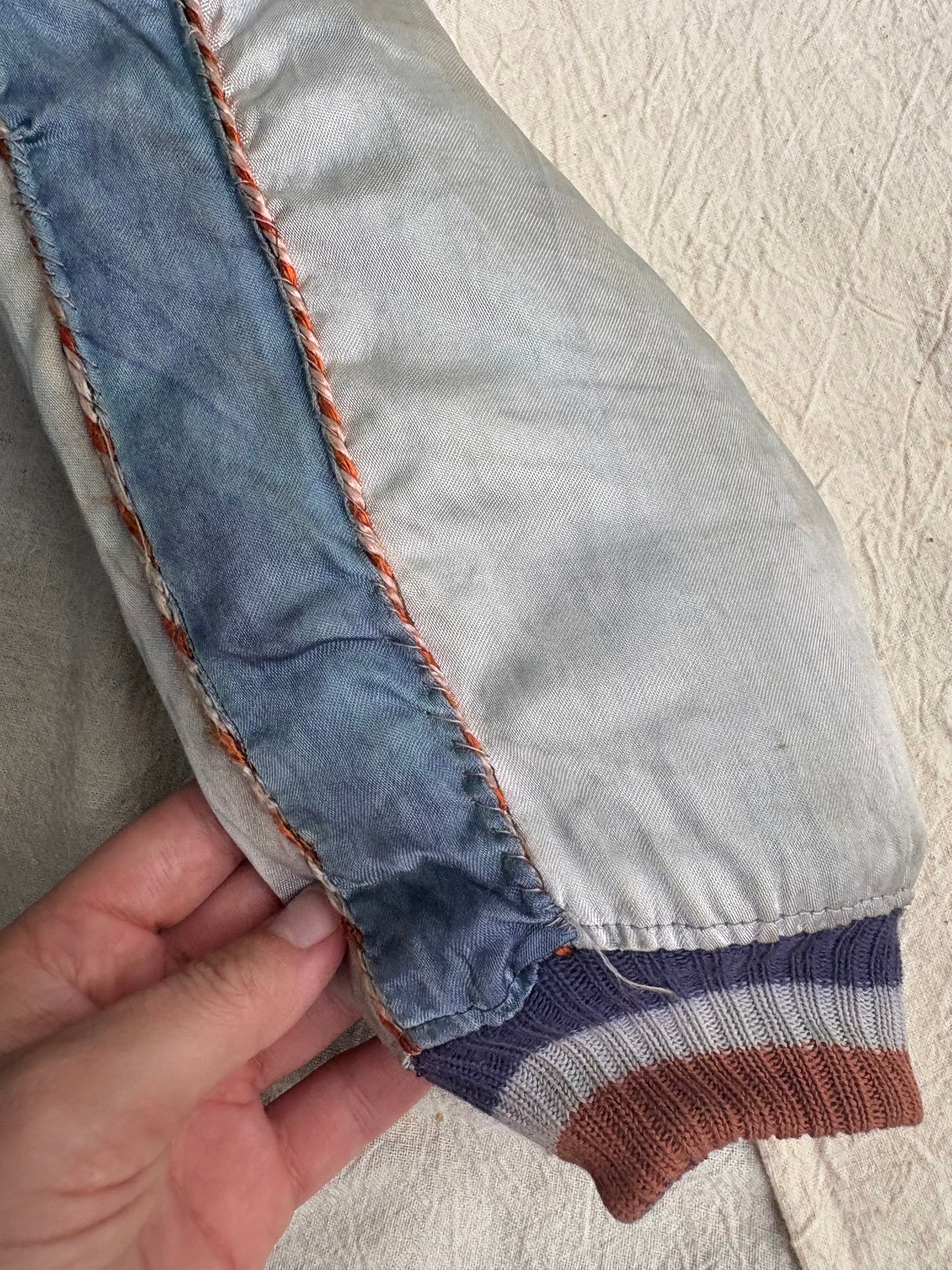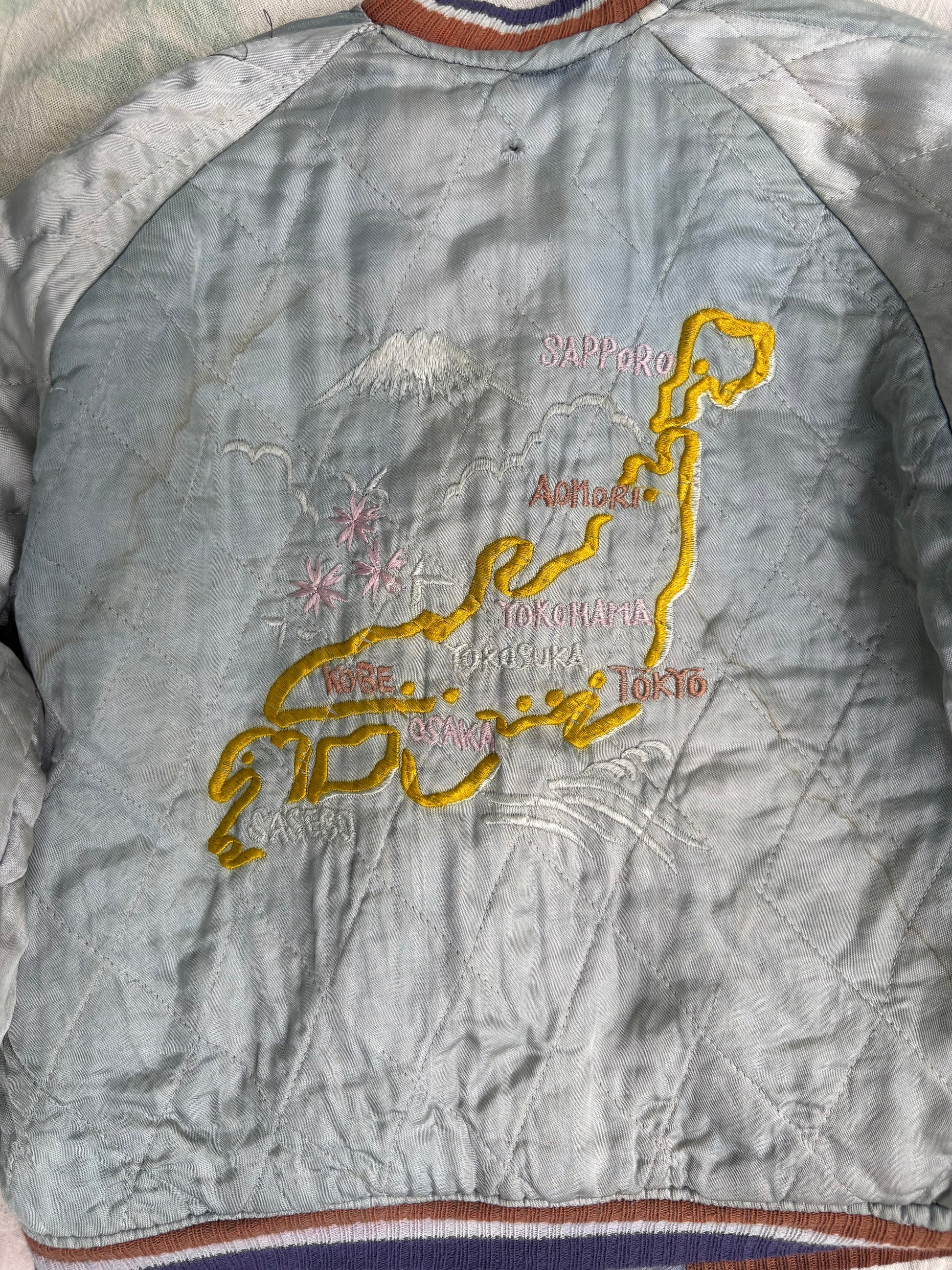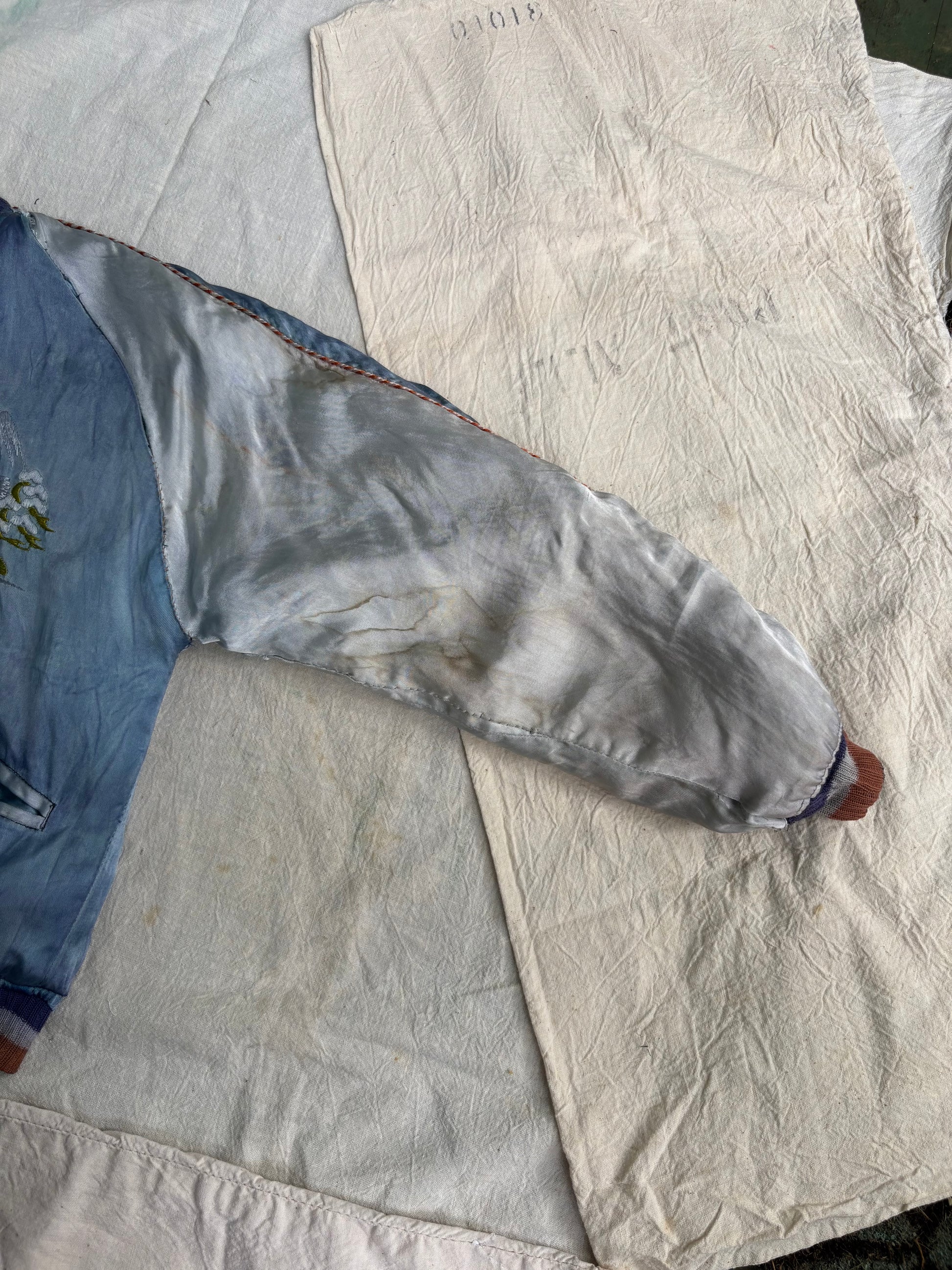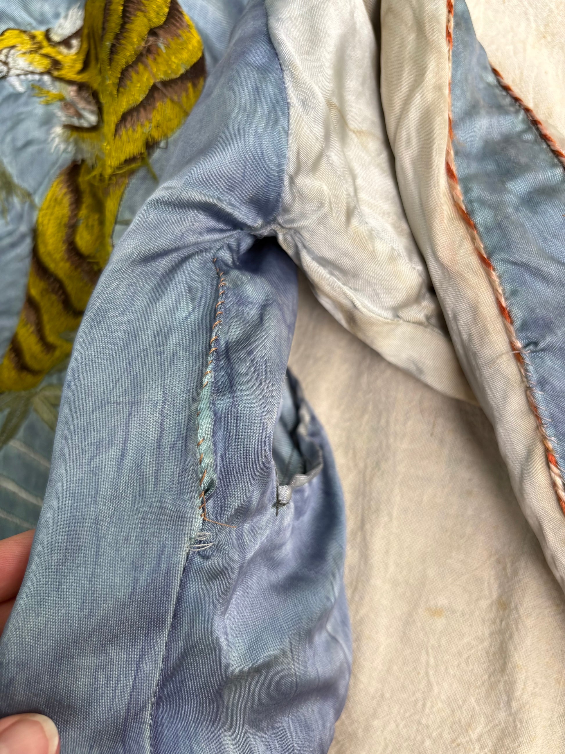 Aqua green and faded royal blue- more slate blue now- reversible jacket. This is a souvenir jacket from Japan during the WWII time period where soldier's would send these and other memorabilia home to their loved ones.