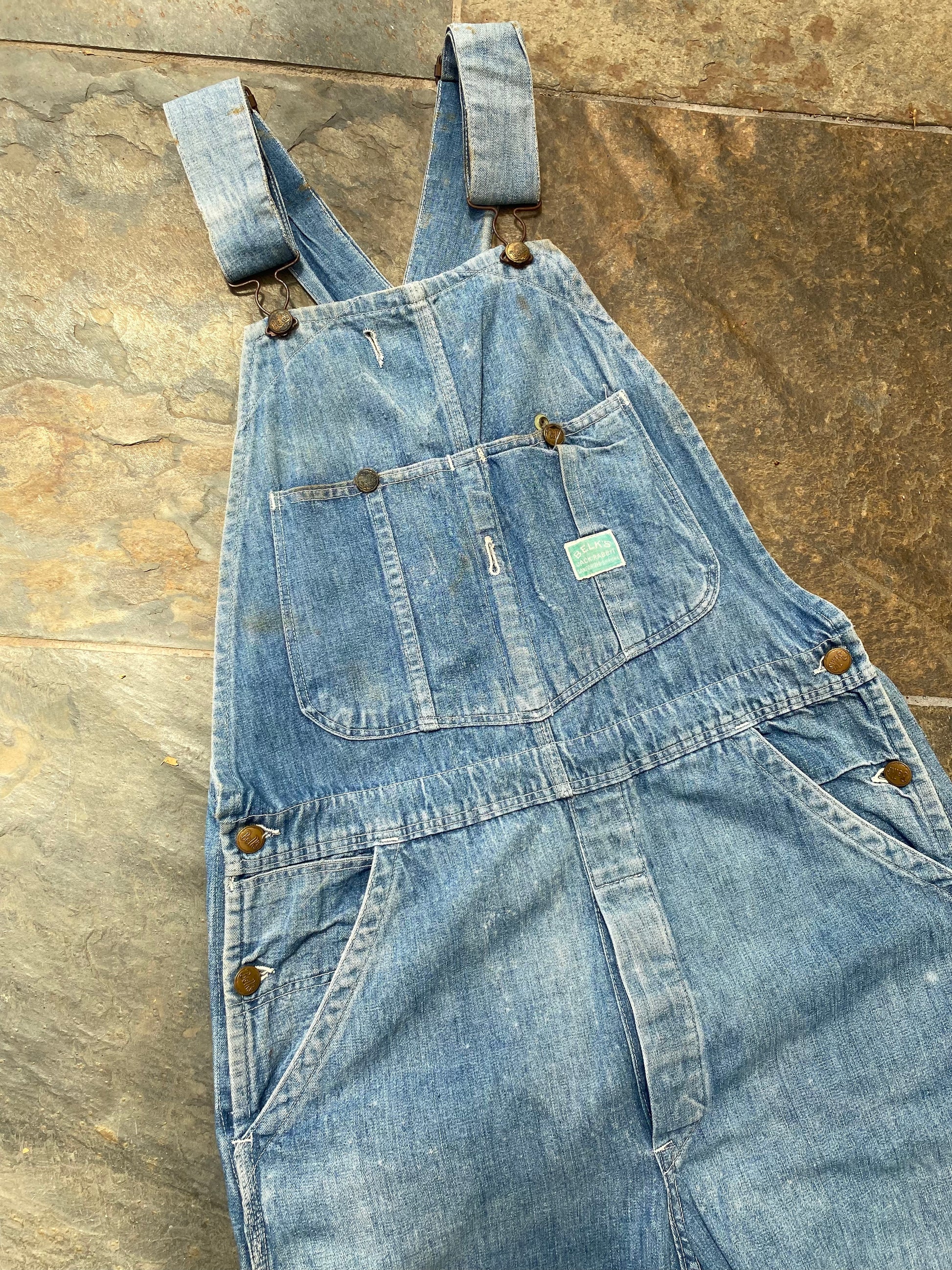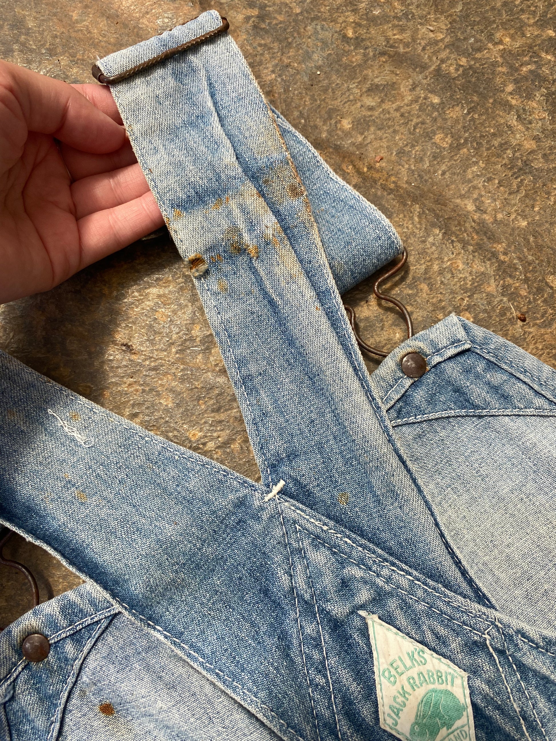 Really great old denim bib overalls ‘Belk’s Jack Rabbit’ Sanforized cotton. All metal hard-wear with donut button closure.