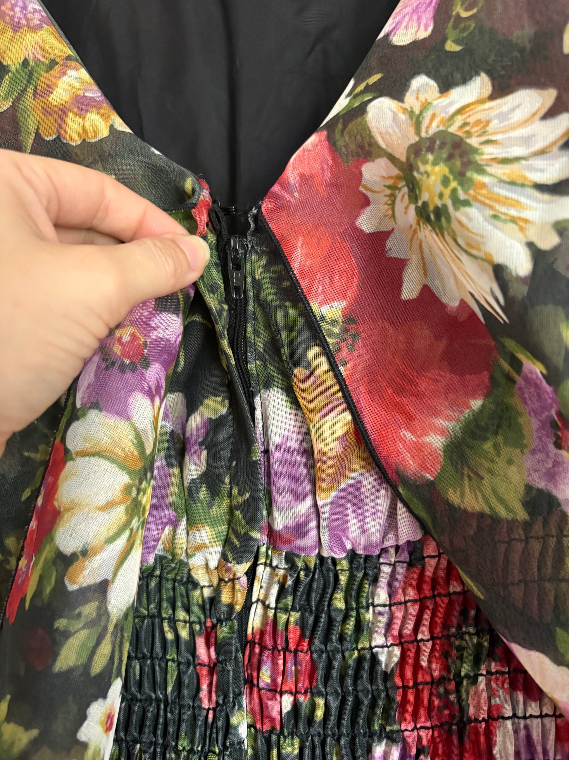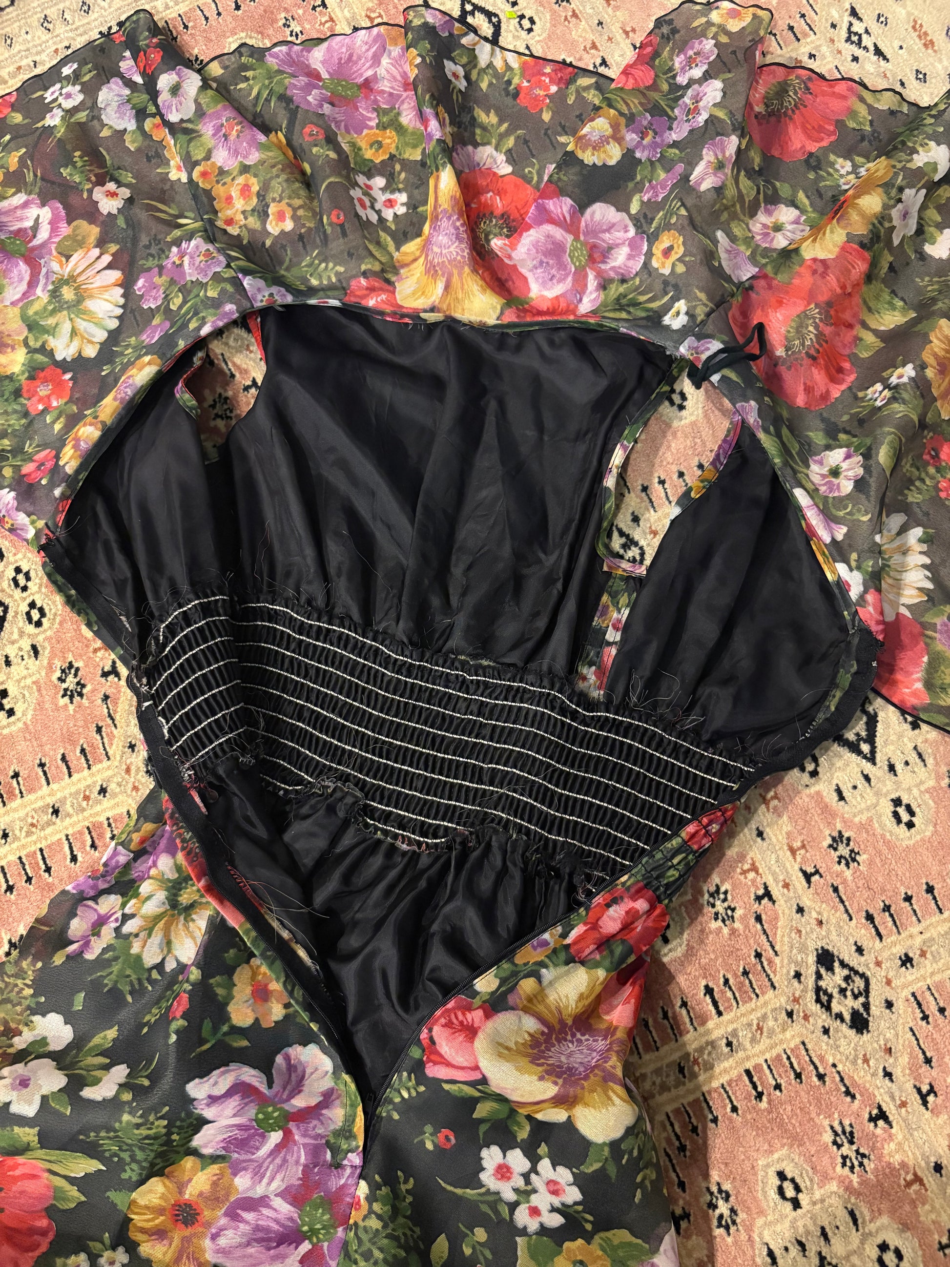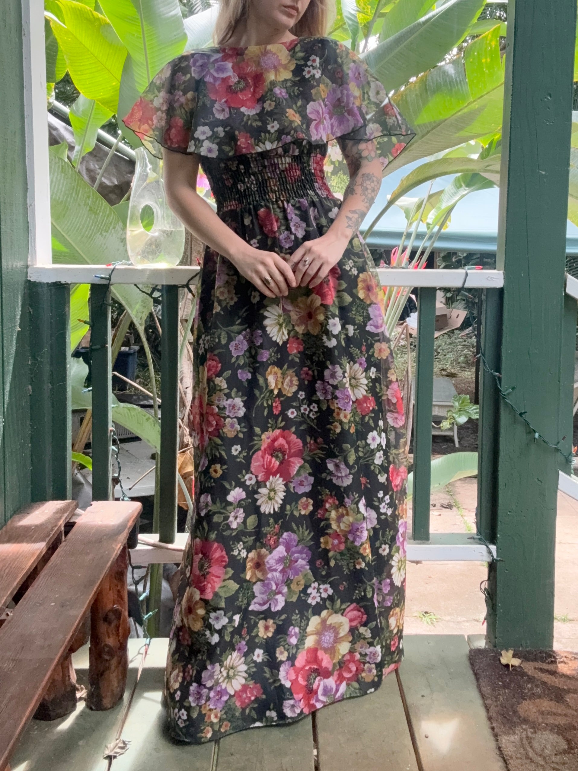 This lovely dress was probably handmade in the 1970s- there are no labels. Sewn by a professional based on the precision of the stitching. 7 rows of elastic synching at the waist- in excellent condition with 100% good stretch still left in the elastic. This dress features an attached shawl collar with the same semi sheer fabric used on the rest of the outer layer of the dress. This is a timeless piece for a collection with beautiful florals of red yellow and purple poppies. This dress is lined with a black acetate fabric beneath the semi sheer floral fabric which I also believe is an acetate fabric or nylon blend.- wrinkle resistance on the outside floral fabric.