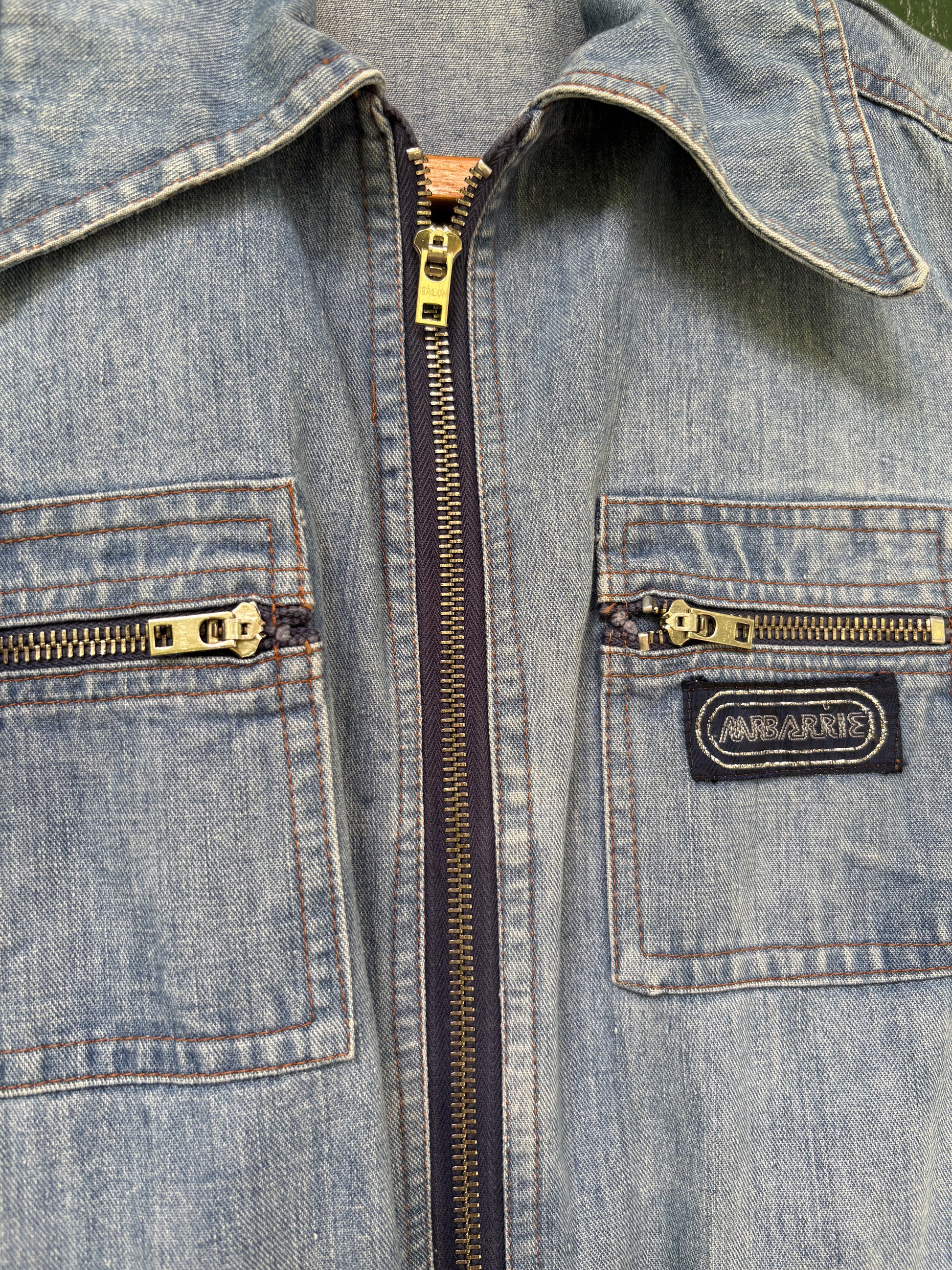 This is an all cotton denim jumpsuit by the brand Mr Berrie. Featuring 2 front chest talon zipper pockets and 2 front hip pockets. There is another metal talon zipper in the front with 2 built in belts to adjust waist. No pockets in the back. Snap closure at the cuff of the long sleeves.