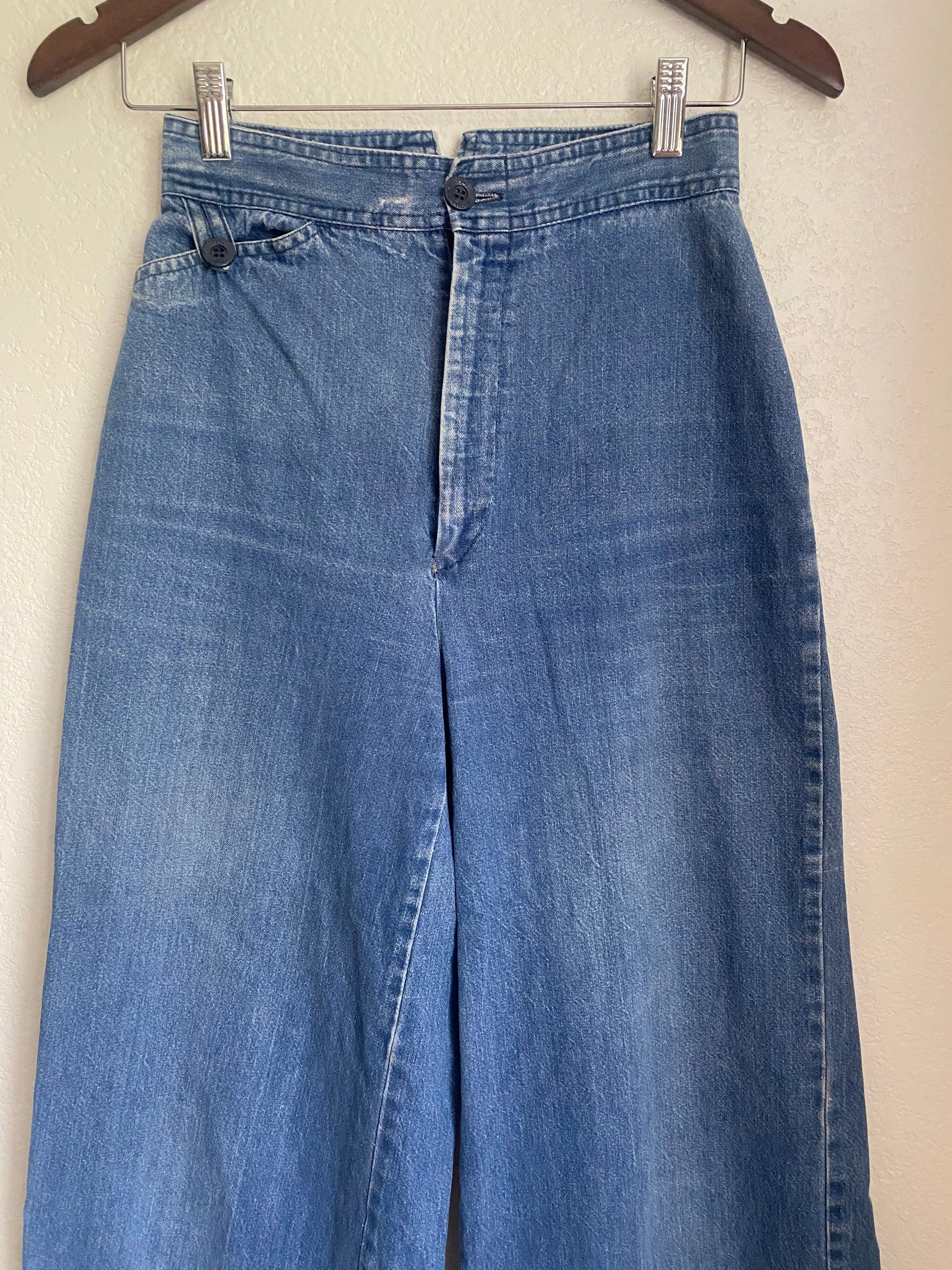Really great pair of 100% cotton Pulse Bellbottoms from the 70s. Cute little button in the back at the waistline and front pocket.