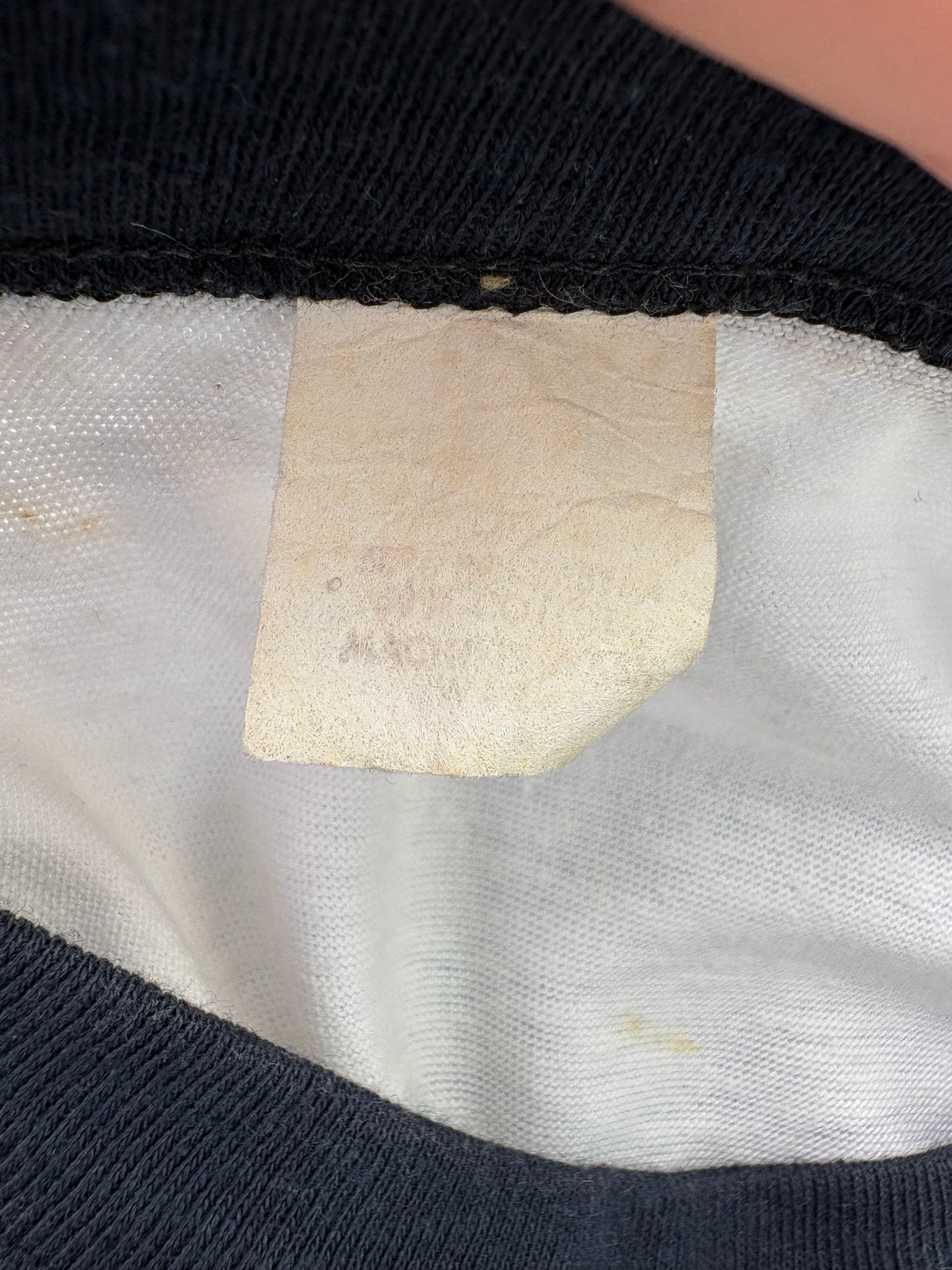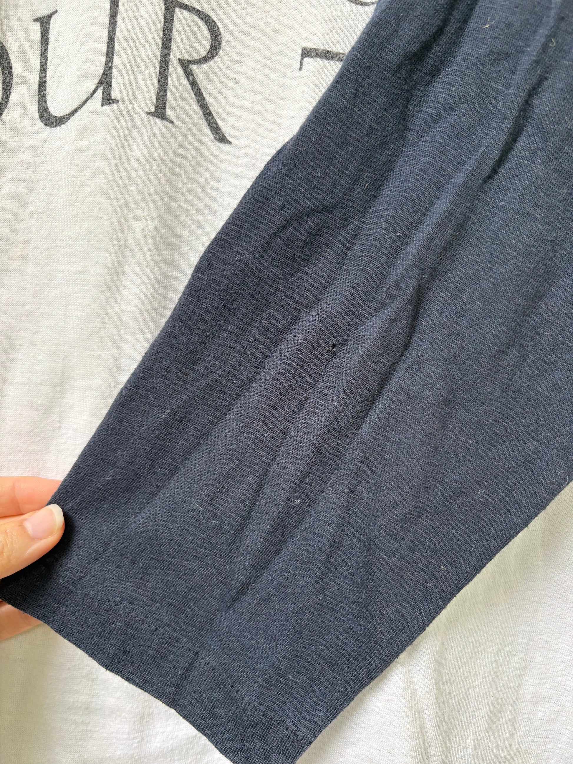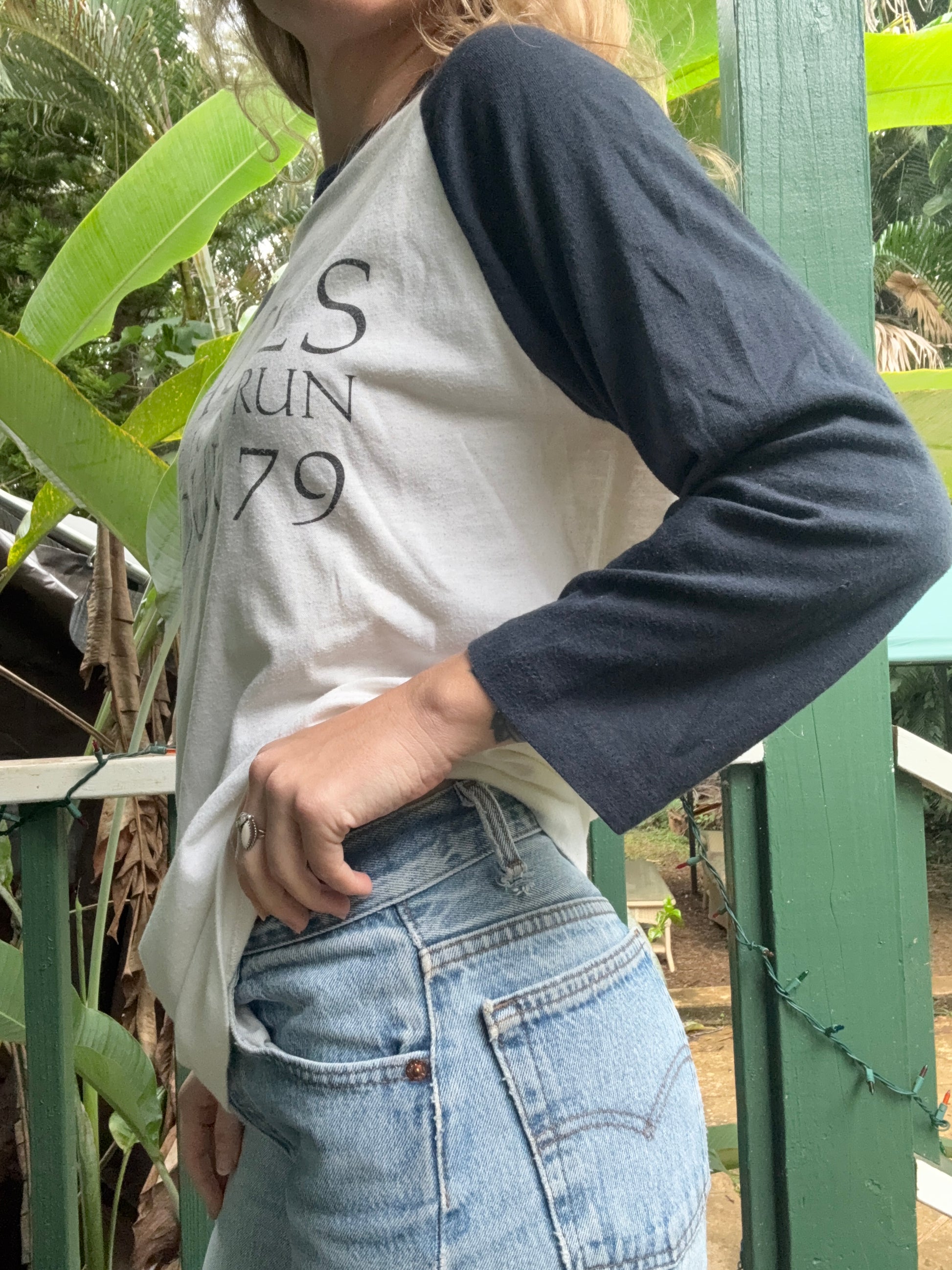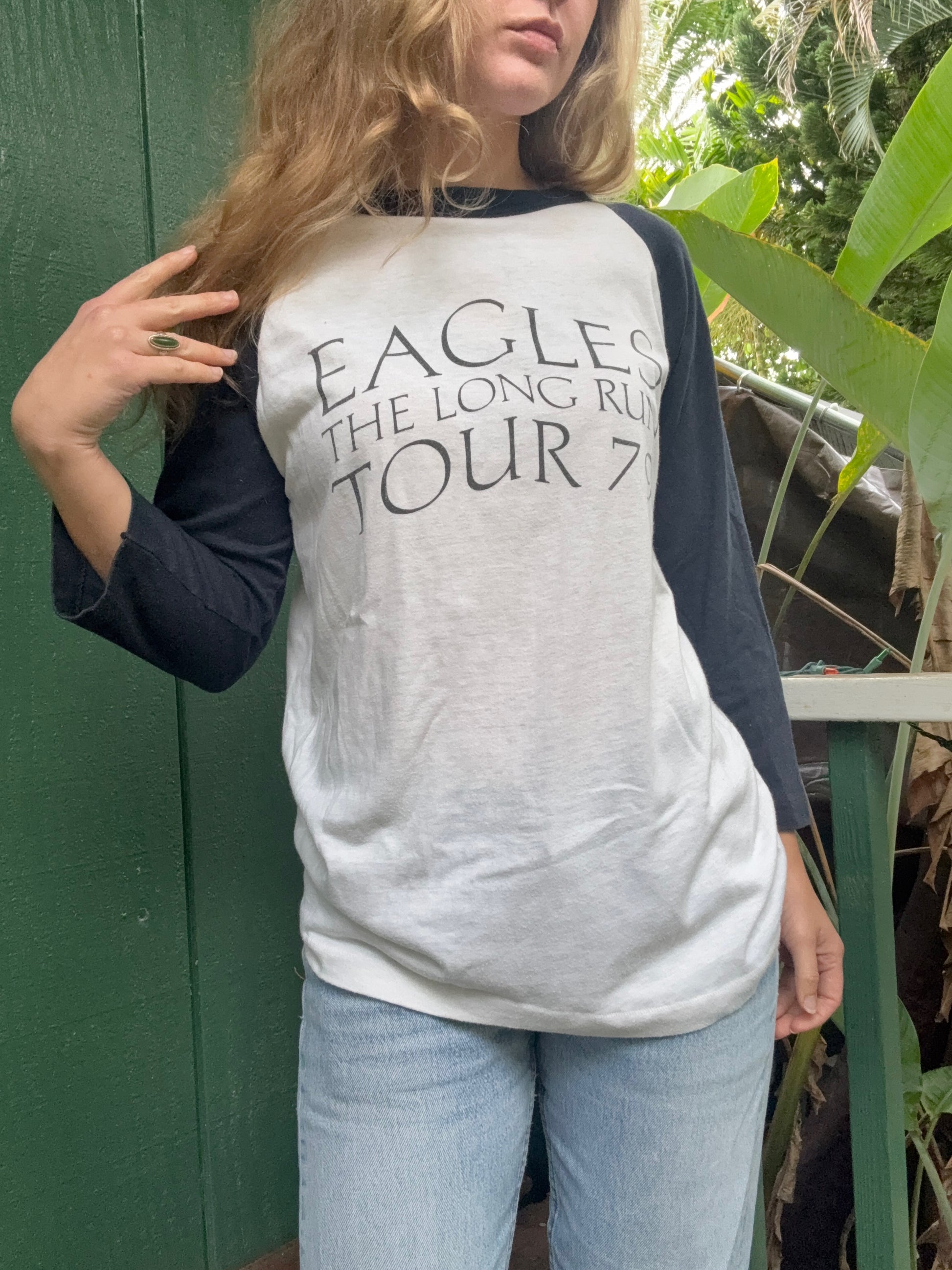 This lightweight navy blue and white baseball raglan is a concert shurt from the Eagles The Long Run Tour in 1970. The tag is unreadable- it feels like a poly cotton blend with nice stretch. single stitch